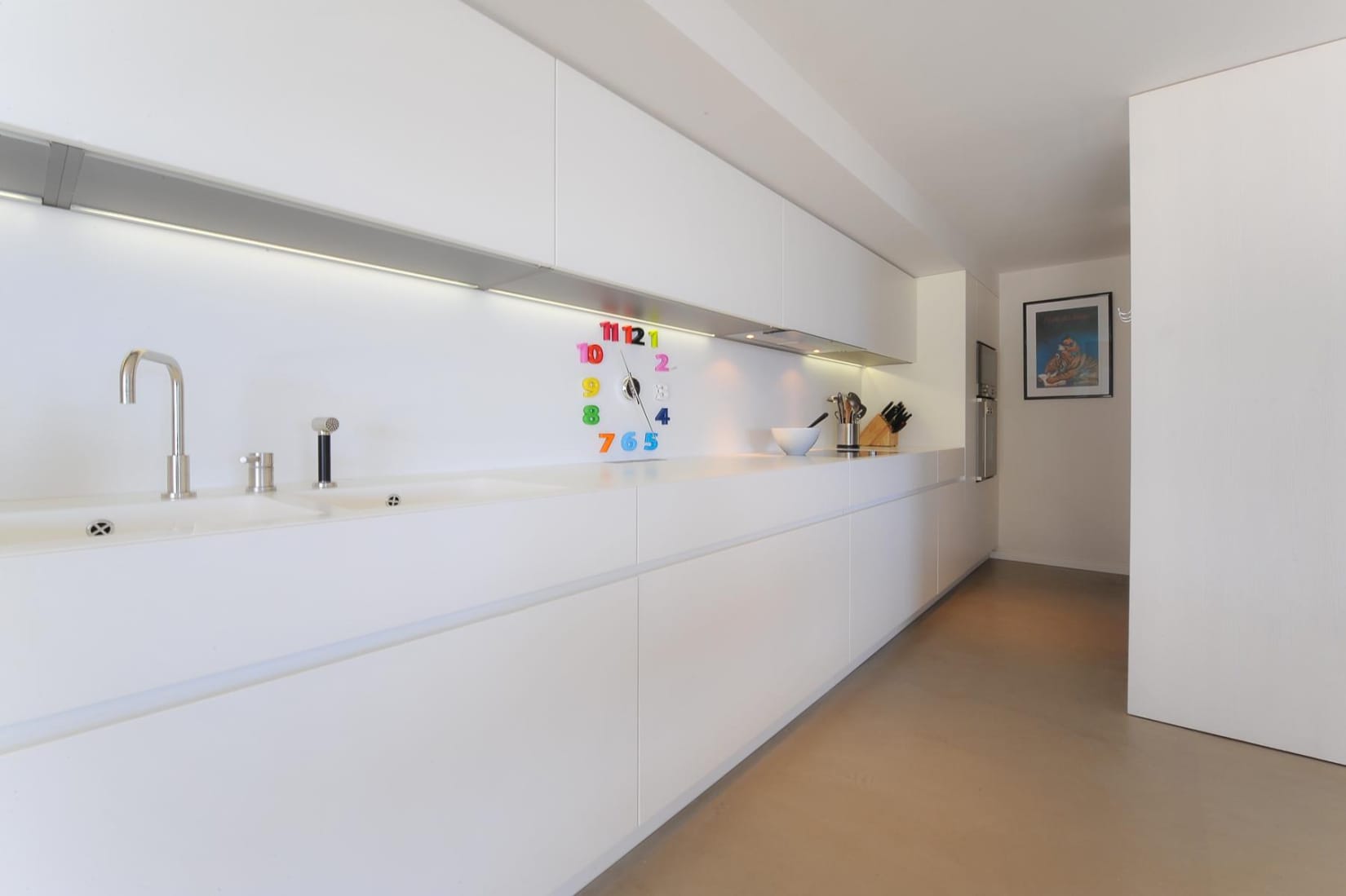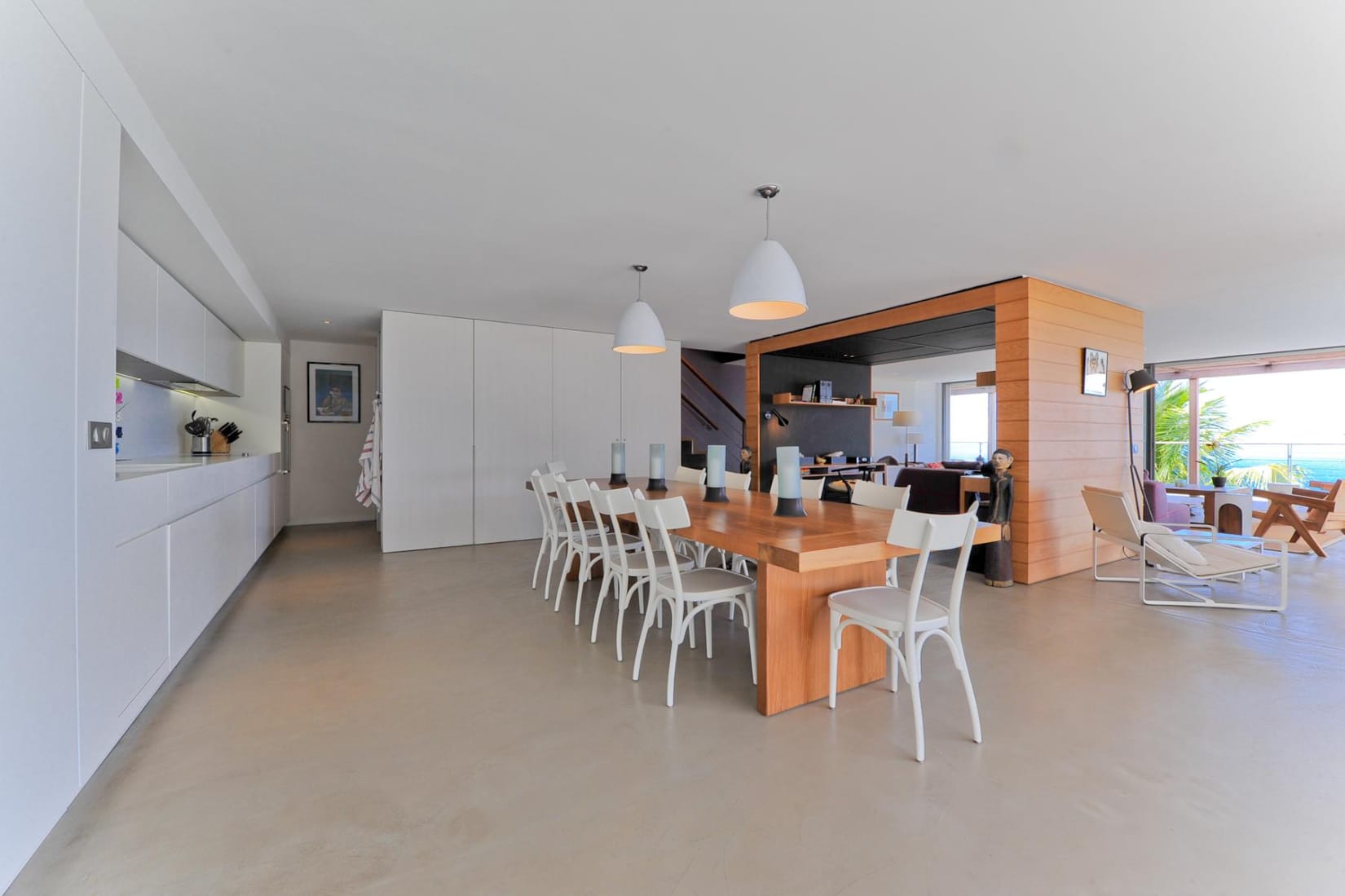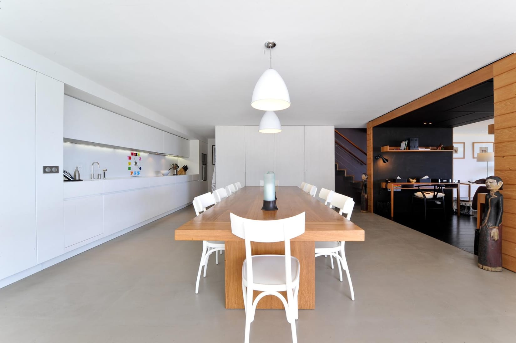 A semi-enclosed office space separates the spacious living area from the kitchen. A large dining table sits in front of the modern, well-equipped kitchen where appliances are hidden behind sleek, white panels. The living room, as well as the rest of the villa, is tastefully furnished and decorated.